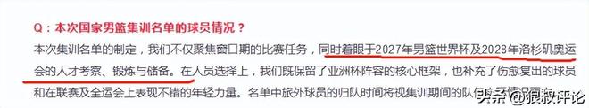 有球迷感叹中国男篮模糊战术体系,多次公开表态以2027年世界杯和2028年奥运会周期寻找合适人才,争取奥运会门票。