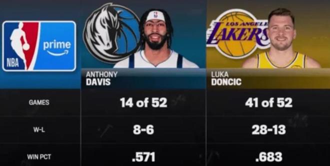 毕竟从交易到独行侠开始,戴维斯就一直伤病不断,在赛前,有美国媒体晒出戴维斯和东契奇交易后的球队战绩对比,戴维斯此前一共仅为独行侠打了14场比赛,球队胜率57%,而东契奇为湖人打了41场比赛,球队胜率68%!