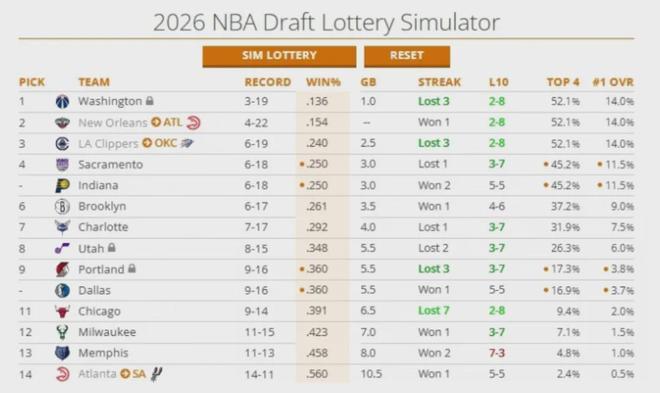 这样一来,快船在2026年抽中状元签的概率提升到了14%,跟奇才和鹈鹕并列第1,首轮签前四的概率则是52.1%。