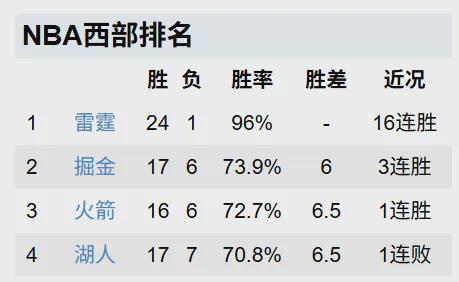 目前雷霆24胜1负高居联盟第1,他们追平了73胜赛季的勇士的开季战绩,一路势如破竹,非常强悍。