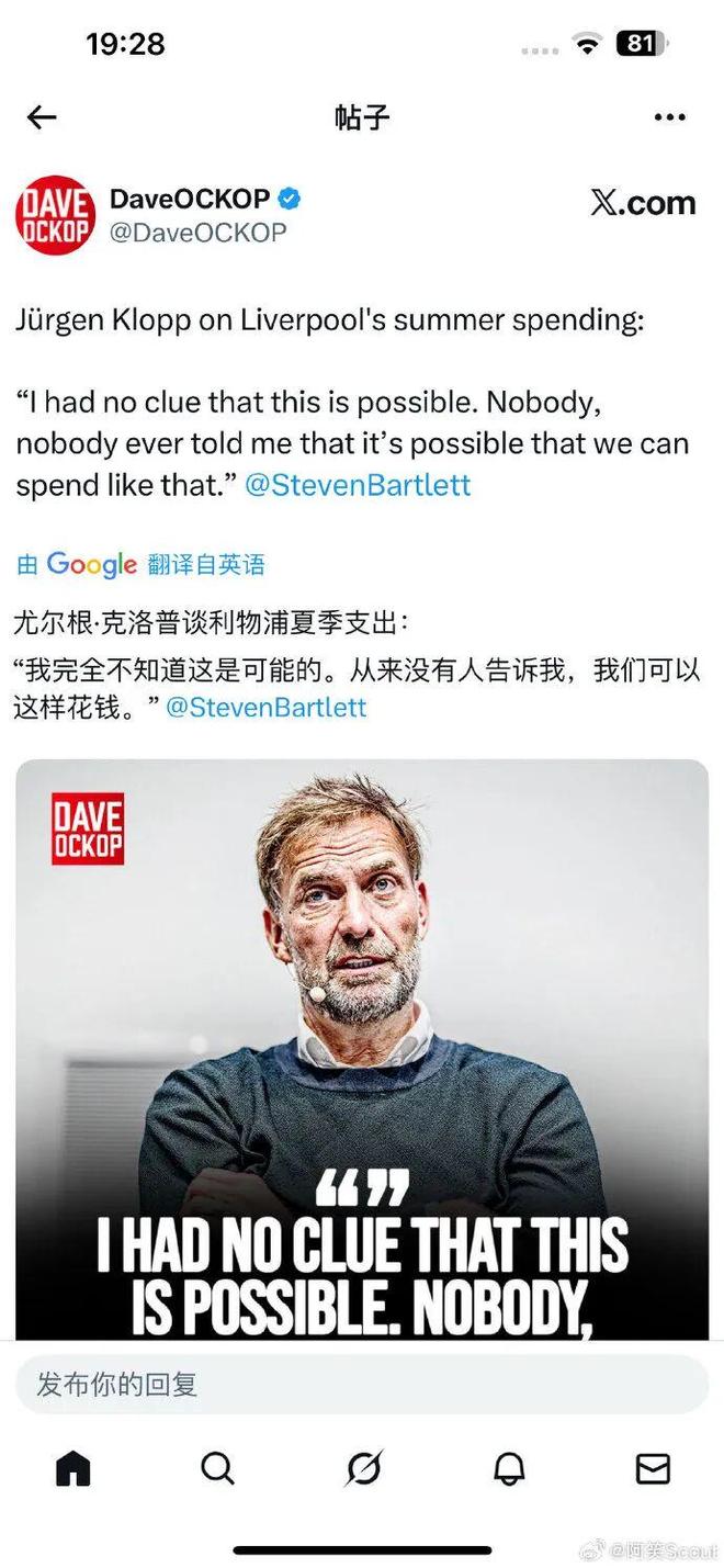 微笑插播:尤尔根·克洛普谈到利物浦今夏的引援支出时表示:“我完全不知道这竟然是可能的。没有人——真的没有人——曾告诉过我,我们竟然能花到这种程度。”