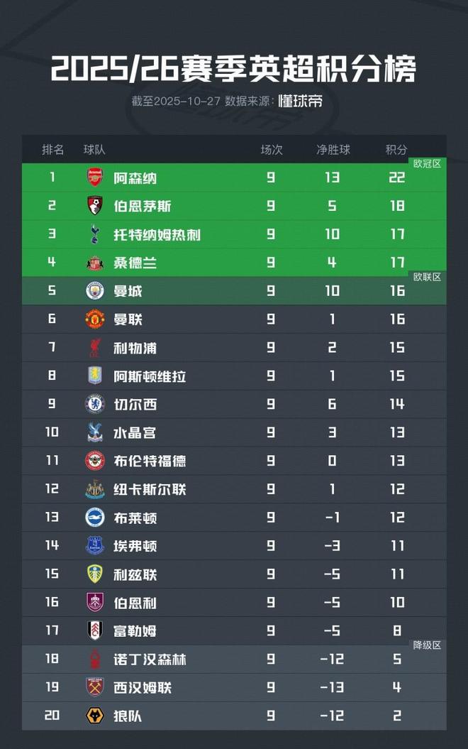 截至2025年10月27日,英超25-26赛季第九轮比赛全部结束。阿森纳以22分高居榜首,与伯恩茅斯、热刺和桑德兰组成了新的“争四集团”。而另一端的狼队则持续低迷,开季至今仅取得2平7负,积2分垫底。